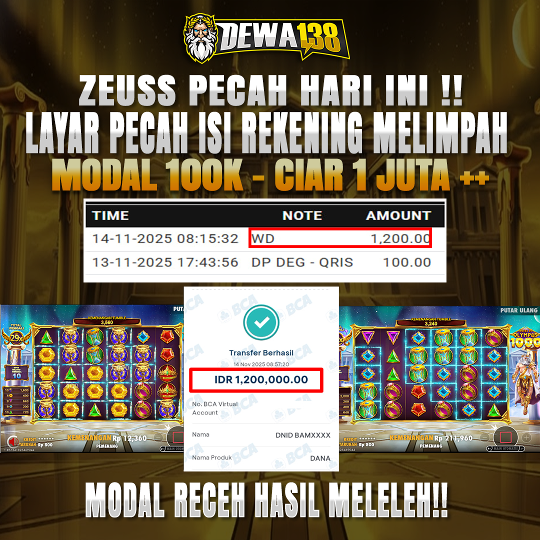 DEWA138 menghadirkan game jackpot vip yang di lengkapi fitur khusus new member hanya dengan modal deposit 90k dijamin akan withdraw 3,2 juta malam ini.